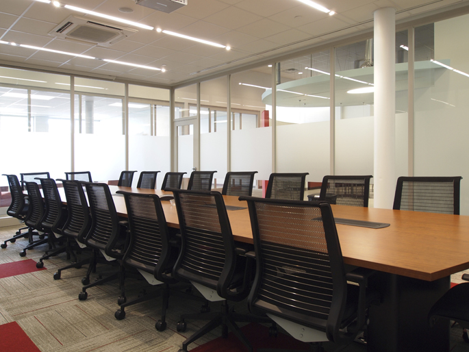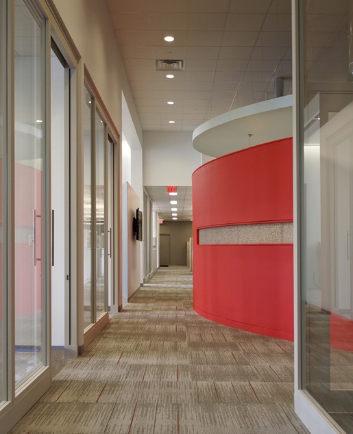 The design idea for the headquarters of Arrow Fastener office renovation is to provide a pleasant and collaborative working environment in a compact, efficient fashion. The heart of the office is centered on a café style staff break area and an adjacent glass enclosed conference/training room to form the “forum” of the office. The openness of the public area creates a social and collaborative environment, which fosters openness and team work within the office. All individual enclosed offices are separated from the public walkways by transparent glass partitions. This transparency also helps to bring natural light deep into the inner areas of the office space. Vibrant colors in the Staff Break Room and far end of the east wall infuse a pleasant and energetic atmosphere into the simple and efficient working environment.