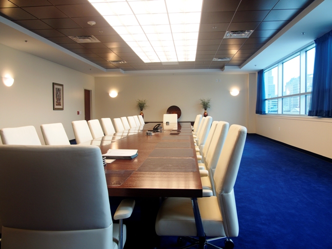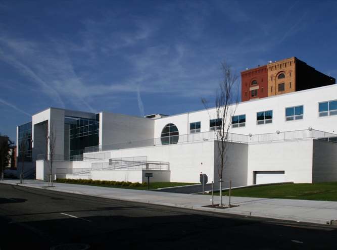 The monochromatic exterior wall is clad with white textured brick, symbolic of the white gloves associated with its founder, Mary Burch. Light is transmitted to the interior through regularly spaced punched window openings and also via a two story high curtain wall system on the building’s main façade.