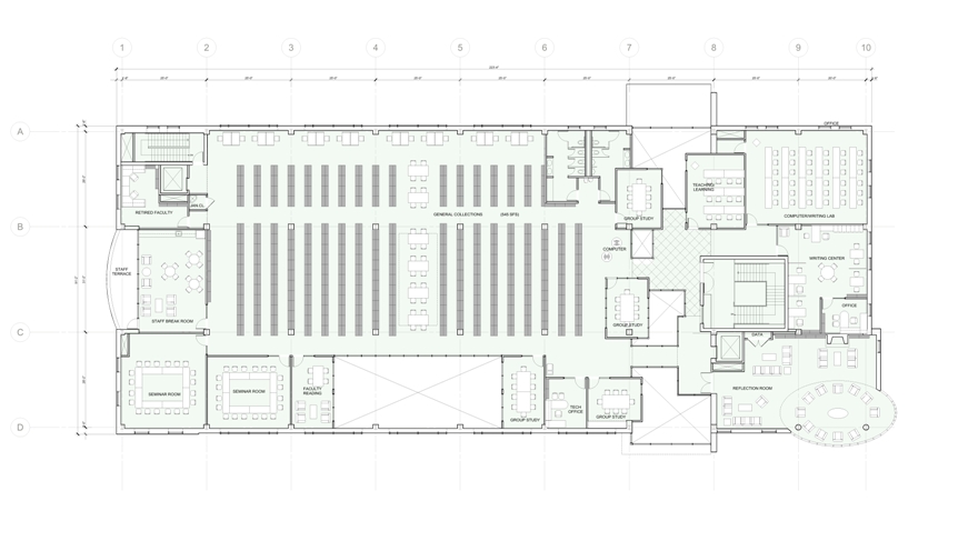 With the 50% expansion in the College’s collections, the library also provides greatly needed user space making the space much more than a traditional library. The 3-story building features an active communal welcome center, collaborative information commons, many reading rooms, special collection rooms, and quiet contemplative retreats. Users have ubiquitous access to computers including wireless technology, related classrooms, student labs, a Faculty Teaching/Learning Center, Writing Center, Curriculum Center, and Seminar and Conference Rooms. The entry atrium designed with the metaphor of internet cyberspace provides all day access to the 24-hour study / café area. The cozy café and terrace provides an alternative