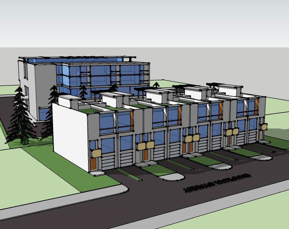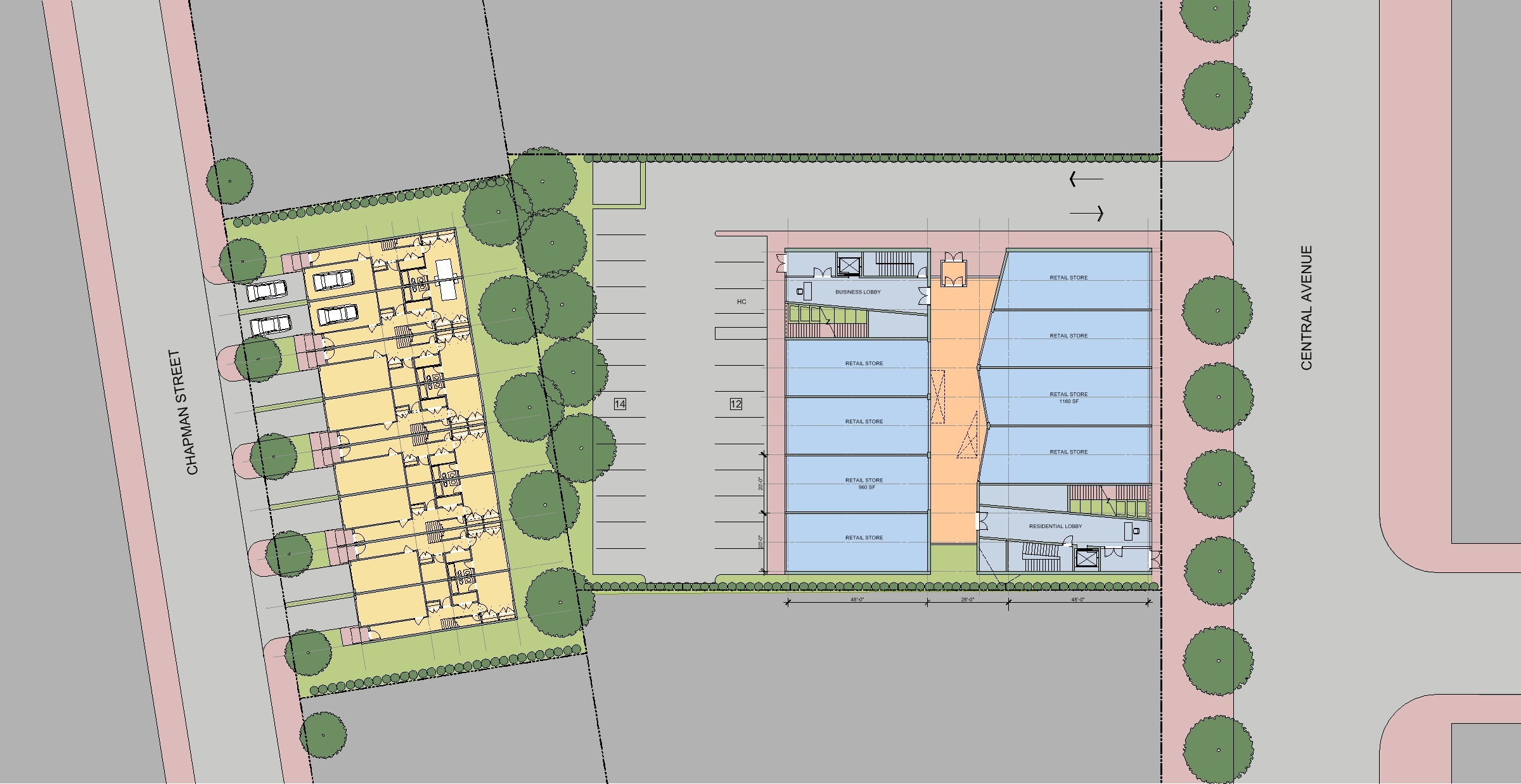 This still in its early design stage project is comprised with two linked lots. The lot facing quiet residential street will build 8 modern townhouses. The other lot facing the commercial Central Avenue will build retail stores on first and second floor and 14 condominiums on third and fourth floor. The thinking behind the development is to bring the healthy sustainable design to this urban environment and to make the retail spaces an urban re-development magnet. The townhouse design provides a green roof for leisure use and an internal courtyard for natural light, ventilation and internal meditation space. The mixed-use building with external stairs from the street and the parking provides direct access to the second floor terrace and retail mall. The condominiums on third and fourth floor have a 28 feet wide elevated street with natural light and ventilation from the clerestory above. The development is aiming for a LEED Silver certification.